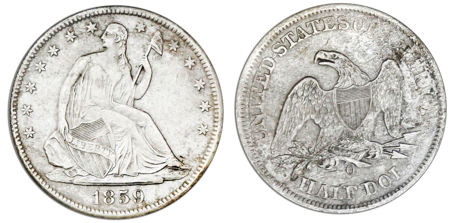 USA (New Orleans mint), half dollar Seated Liberty, 1859-O, NGC SS Republic / Shipwreck Effect. KM-A68. AU with minor saltwater corrosion on surfaces, nicely detailed obverse. NGC #1831040-016. Recovered from: S.S. Republic, sunk in 1865 off Georgia