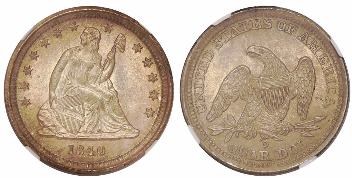 USA (New Orleans mint), quarter dollar seated Liberty, 1840-O, no drapery, encapsulated NGC MS 63, from the New Orleans Bank Find (stated inside slab). KM-64.1. Toned satin surfaces with underlying luster, practically no marks. From a bank hoard found in New Orleans in 1982.