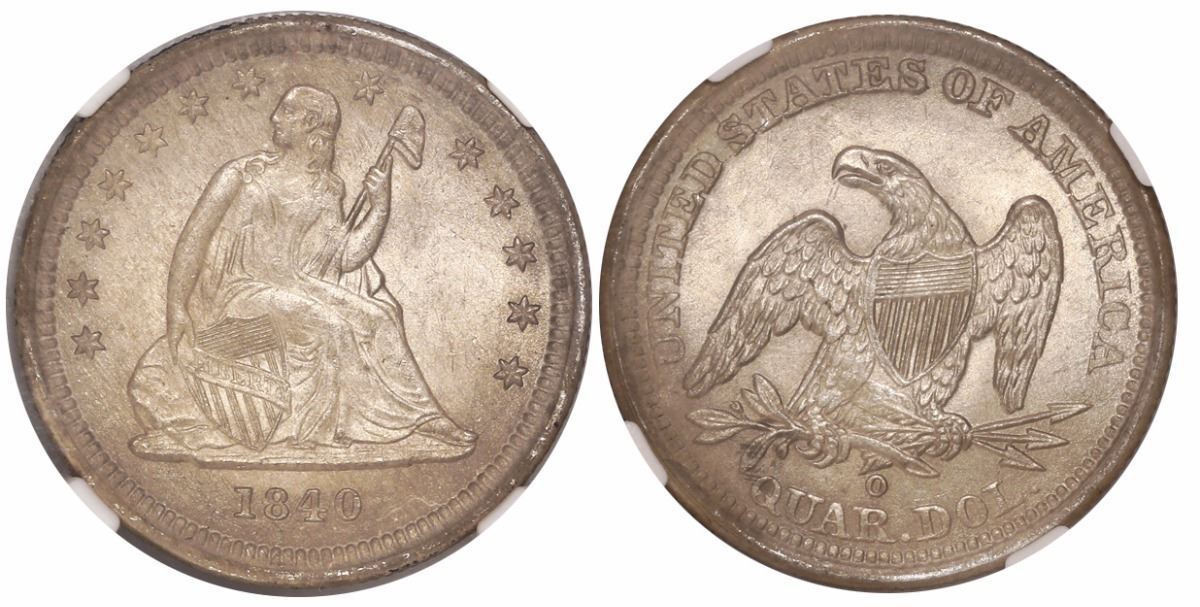 USA (New Orleans mint), quarter dollar seated Liberty, 1840-O, with drapery, encapsulated NGC MS 63, from the New Orleans Bank Find (stated inside slab). KM-64.2. Faint toning atop muted luster all over, practically no marks. From a bank hoard found in New Orleans in 1982.