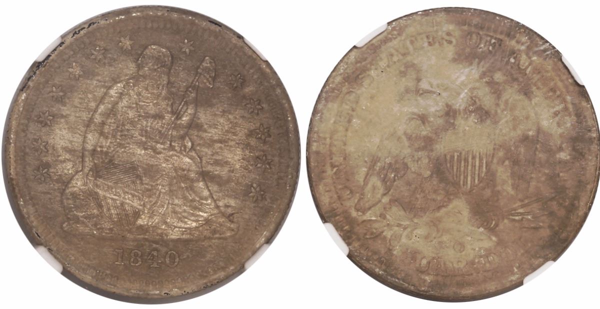 USA (New Orleans mint), quarter dollar seated Liberty, 1840-O, with drapery, encapsulated NGC UNC details / environmental damage, from the New Orleans Bank Find (stated inside slab). KM-64.2. Light toning all over, with faint luster in center of obverse only, light surface granularity, no marks. From a bank hoard found in New Orleans in 1982.