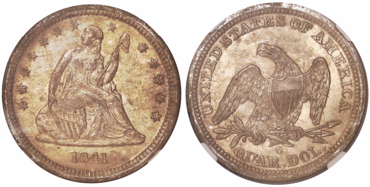 USA (New Orleans mint), quarter dollar seated Liberty, 1841-O, encapsulated NGC MS 63, from the New Orleans Bank Find (stated inside slab). KM-64.2. Lustrous and lightly toned all over, with minor bagmarks only. From a bank hoard found in New Orleans in 1982.