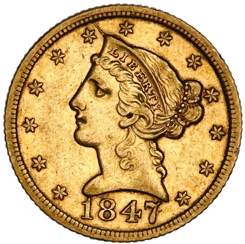 USA (Philadelphia Mint), Liberty Head $5 half eagle, 1847. 8.29 grams. Bright AU with light hairlines in fields, bold design details.