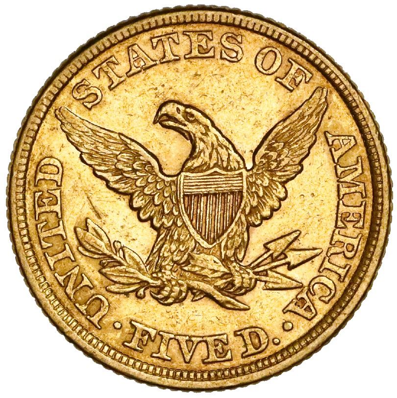 USA (Philadelphia Mint), Liberty Head $5 half eagle, 1857, NGC AU 55. Lightly circulated with some bagmarks, mildly lustrous surfaces with spots of red-orange toning. NGC #5939650-004.