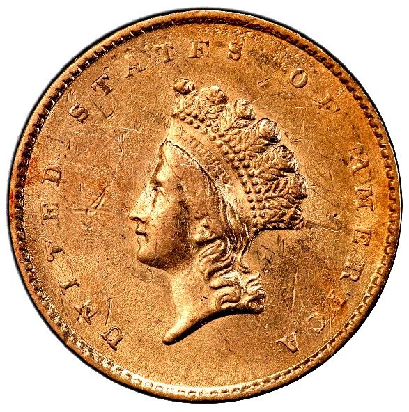 USA (Philadelphia Mint), gold $1 Indian Princess (Type II), 1855, PCGS AU 58 ("top pop"), with pinch