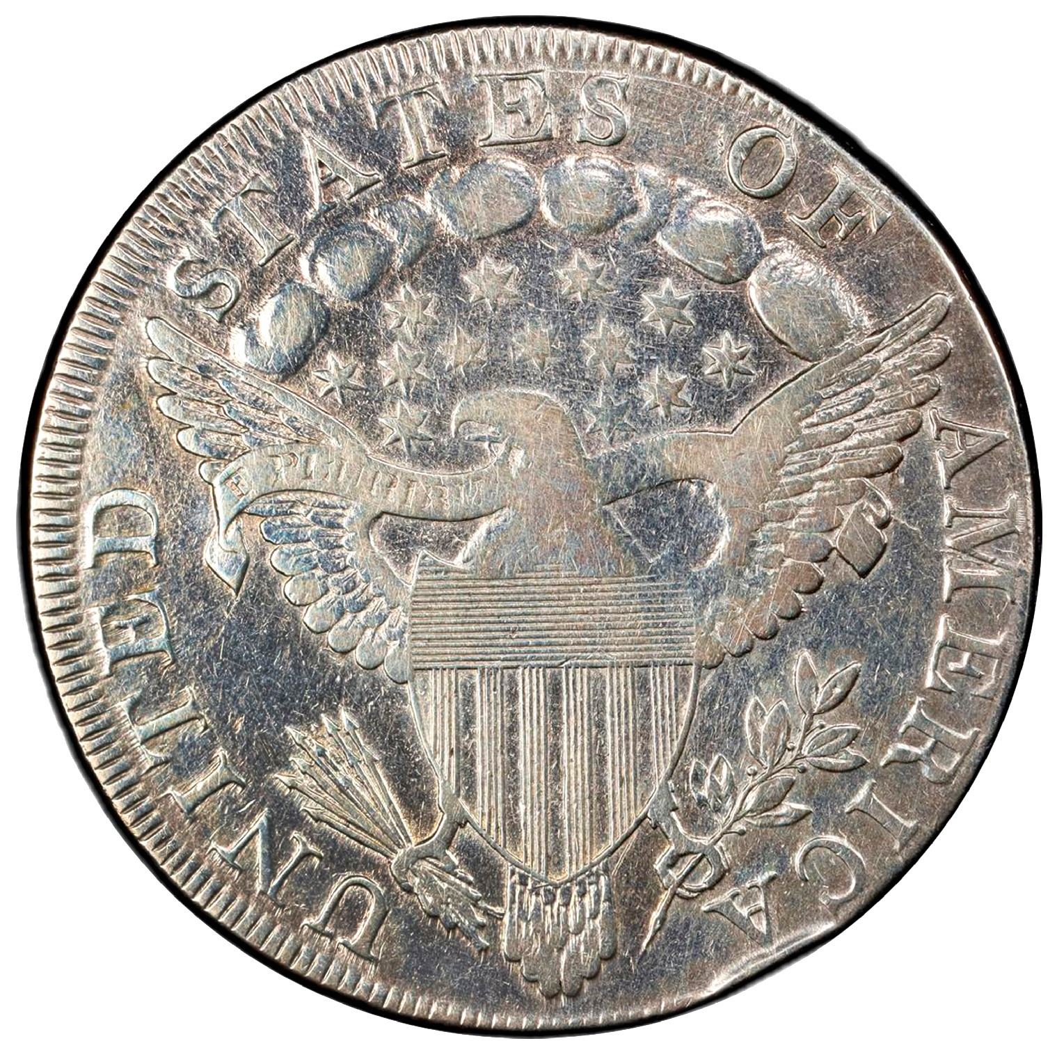 USA (Philadelphia Mint), silver Draped Bust dollar, 1798, large eagle, pointed 9, close date, PCGS Genuine VF details / polished. B-9, BB-121, R.4. Circulated and heavily cleaned yet historical piece as among the first silver dollars of the United States of America, struck during the presidency of John Adams. Bold design details (particularly with Liberty) with several noticeable die cracks including one flowing through the date, polished surfaces now starting to tone over with hues of gold and blue. CPG value (in VF 20): $2,500. Please use this link to verify the certification number
