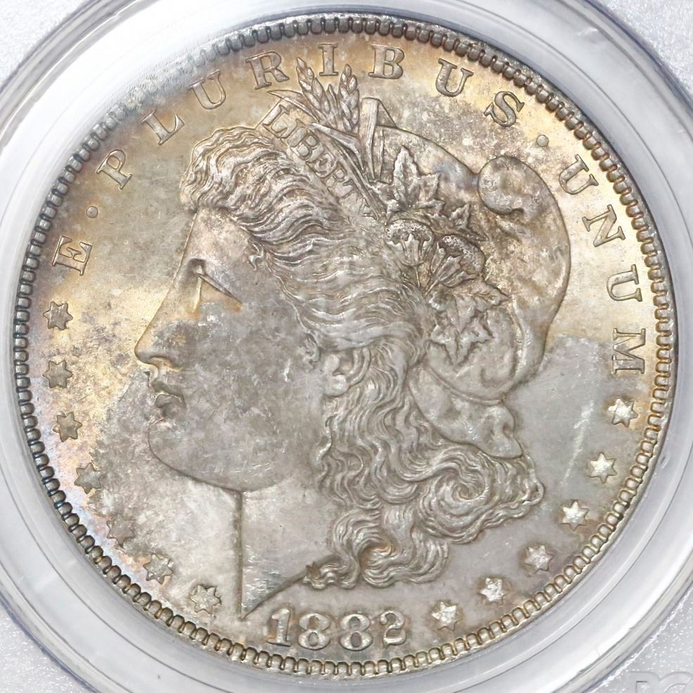 USA (Philadelphia mint), $1 Morgan, 1882, PCGS MS64. Quite lustrous with about half of each side toned an even champagne color while the rest of the surfaces are untoned. PCGS #14110792.