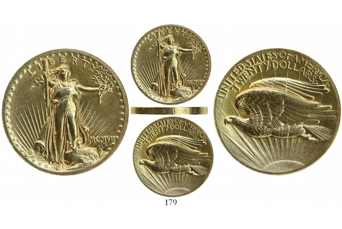 USA (Philadelphia mint), $20 St. Gaudens, 1907, high relief, wire rim. KM-126. 33.39 grams. UNC details but lightly cleaned, starting to tone around details, popular low-mintage issue with perennially high catalog value.