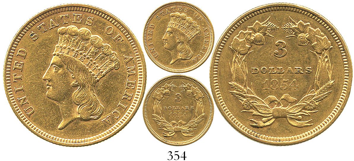 USA (Philadelphia mint), $3 Indian in headdress, 1854. KM-84. Choice XF+ with a hint of toning and luster.
