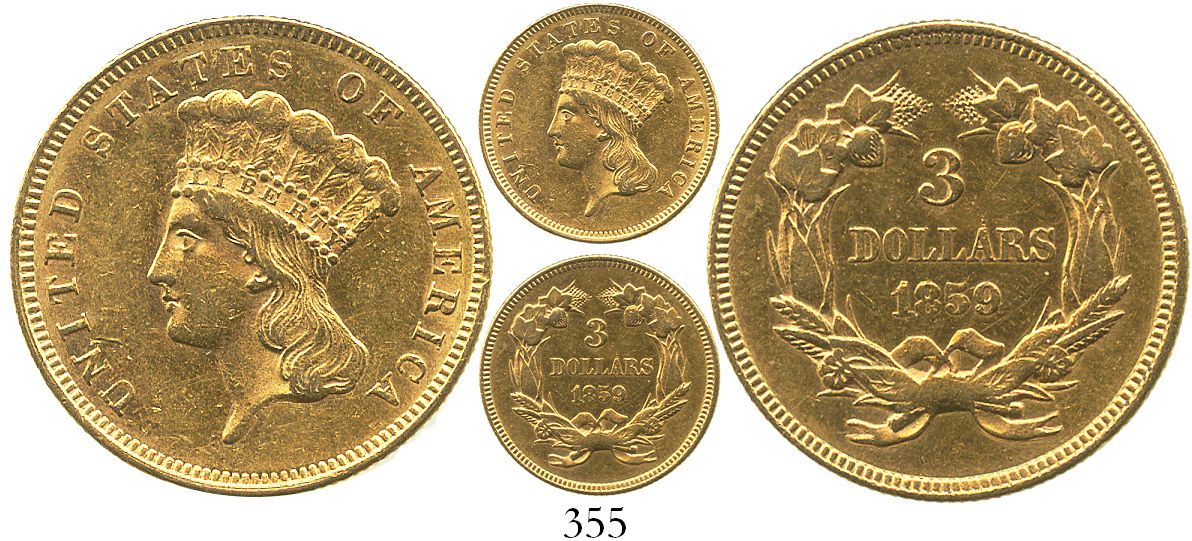 USA (Philadelphia mint), $3 Indian in headdress, 1859. KM-84. Lustrous and lightly toned AU, just a few marks shy of MS.