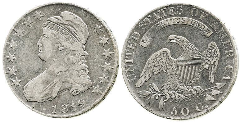USA (Philadelphia mint), 50 cents bust half, 1819. KM-37. 13.3 grams. AXF with traces of luster, slightly crude rims (as made), popular early issue.