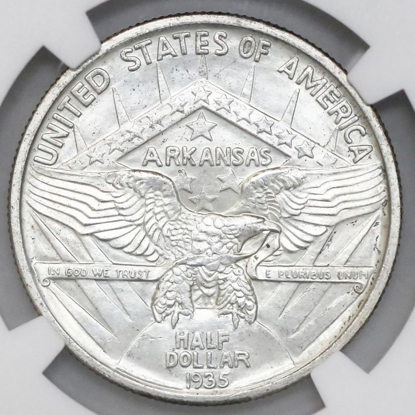 USA (Philadelphia mint), half dollar, 1935, Arkansas, NGC MS 64. Matte surfaces with subdued luster, a few hints of toning but generally white. NGC #4703569-007.