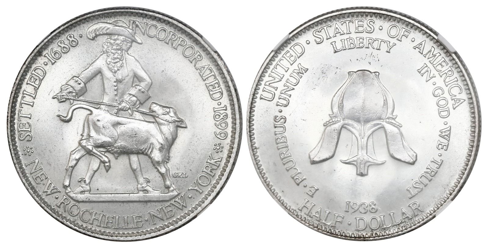 USA (Philadelphia mint), half dollar, 1938, New Rochelle, NGC MS 66. Smooth, silky surfaces with light luster, gem fields with faint rainbow toning throughout. NGC #4703569-008.