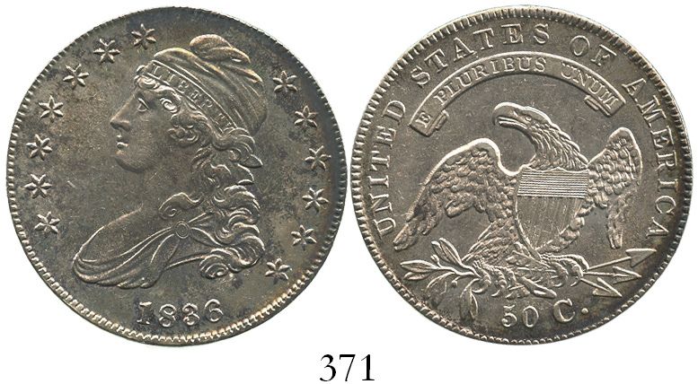 USA (Philadelphia mint), half dollar capped bust, 1836, lettered edge. KM-37; Overton-108. AU/BU with beautiful luster and toning.