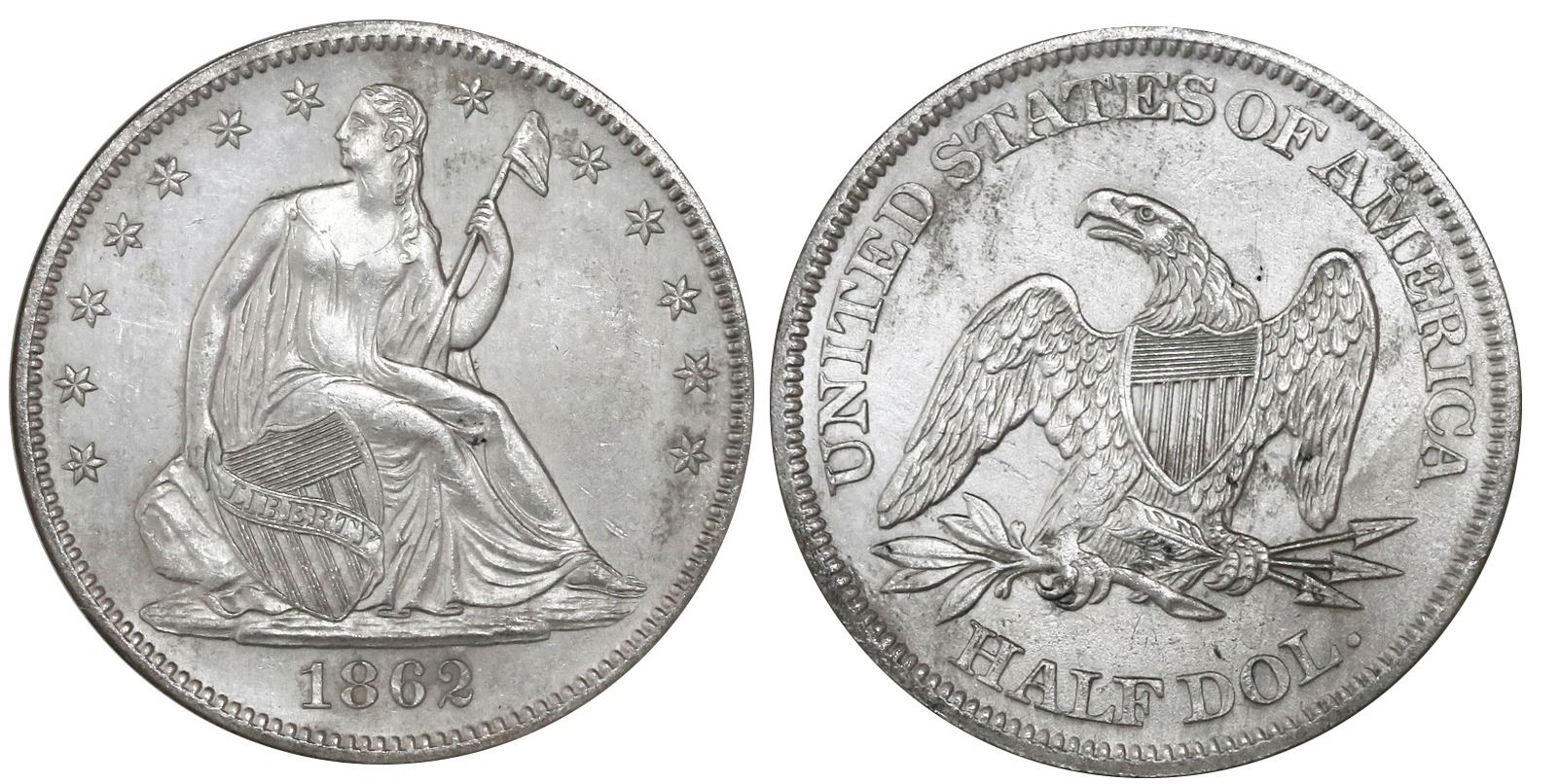 USA (Philadelphia mint), half dollar seated Liberty, 1862, encapsulated NGC SS Republic Shipwreck Effect. Slightly hazy appearance from light corrosion but with strong details remaining, particularly on the eagle, a very rare date (only 137 recovered) from the S.S. Republic. Q. David Bowers reports in "The SS Republic Shipwreck Excavation Project: the Coin Collection" that "just 489 coins range between 1831-52 (1%), with the majority of 41,671 spanning the years 1853-61 (88.2%), with the greatest peaks in volume evident for the years 1858 (9,587) and 1861 (14,158). A sharp decline is witnessed for the period 1862-65, which is represented by just 338 issues (0.7%), of course reflecting disruptions in production and circulation during the American Civil War (1861-65)." A table in the report shows that just 185 halves from 1862 were recovered: 137 from the Philadelphia mint and 48 from the San Francisco mint. NGC #1797743-011. With salvager's certificate. S.S. Republic, sunk in 1865 off Georgia