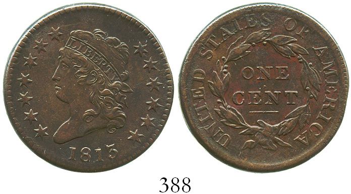 USA (Philadelphia mint), one cent (classic head), 1813. KM-39; Sheldon-292. 10.8 grams. Well-struck AU, medium-brown color, minor surface porosity.