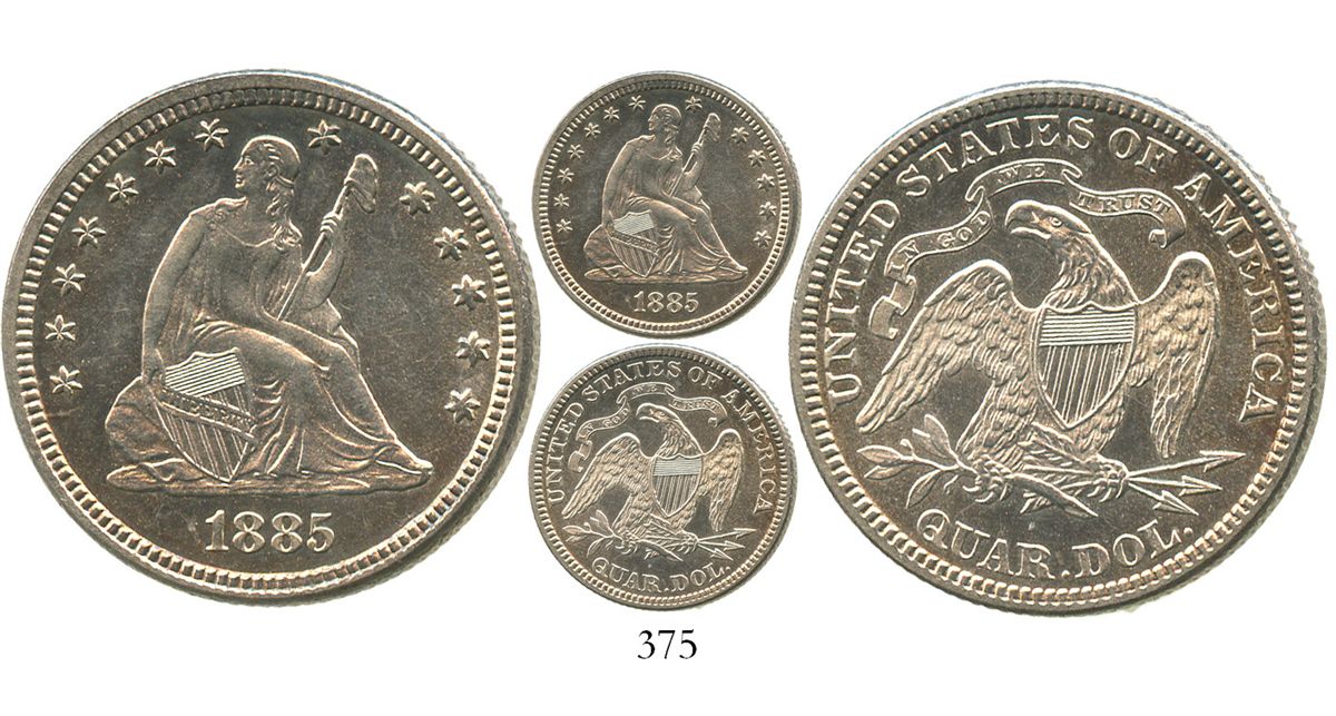 USA (Philadelphia mint), quarter dollar (seated) Liberty, 1885. KM-A98. Lustrous Mint State with faint hairlines on obverse only, toned near rims, low mintage.