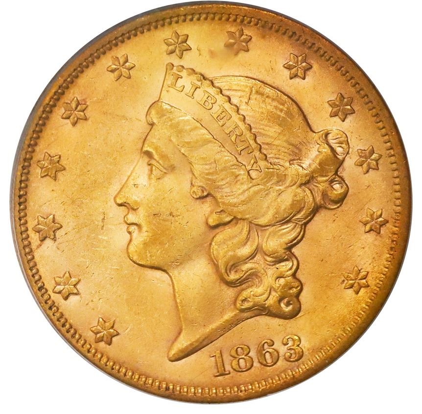 USA (San Francisco Mint), gold $20 Coronet Liberty "double eagle," 1863-S, PCGS AU58 / Brother Jonat