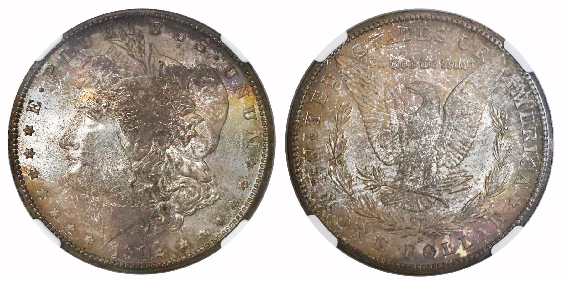 USA (San Francisco mint), $1 Morgan, 1902-S, NGC MS 65. gray toning over muted luster giving a rather matte appearance to the surfaces, streaks of lustrous silver, hints of colorful gold and red toning. NGC #2044772-017.