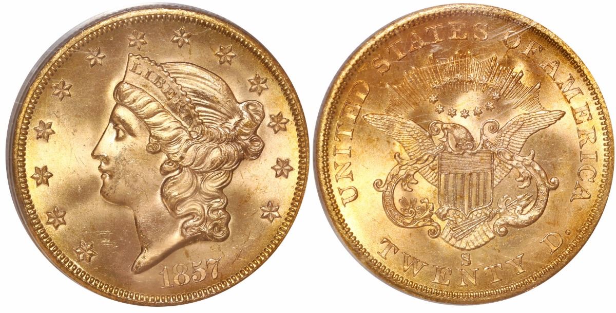 USA (San Francisco mint), $20 Coronet Liberty, 1857-S, encapsulated PCGS MS64 / S.S. Central America / 20B Bold S, from the S.S. Central America (1857). KM-74.1. Lovely satin surfaces with eye-catching luster, just a few minor bagmarks in obverse field and on Liberty's cheek, otherwise every bit as nice as higher-grade specimens we have seen. From the SS Central America (1857), as stated inside the slab.