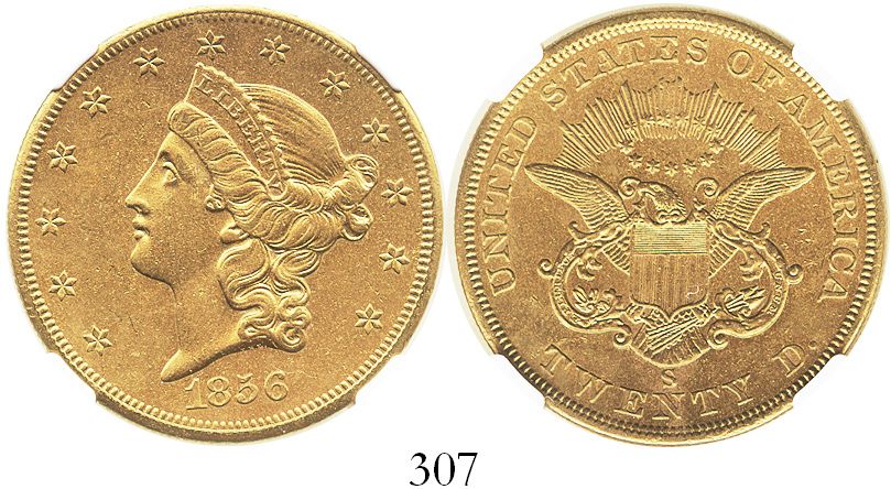 USA (San Francisco mint), $20 (double eagle) coronet Liberty, 1856-S, encapsulated NGC UNC details /