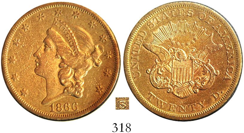 USA (San Francisco mint), $20 (double eagle) coronet Liberty, 1866-S, no motto, very rare.
