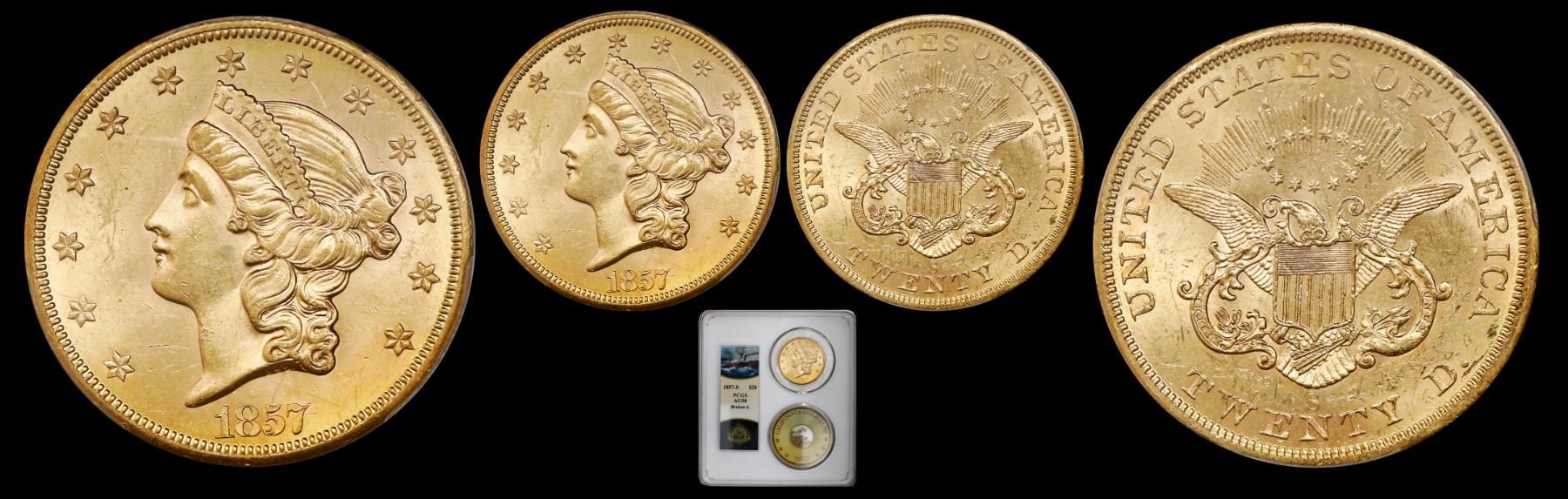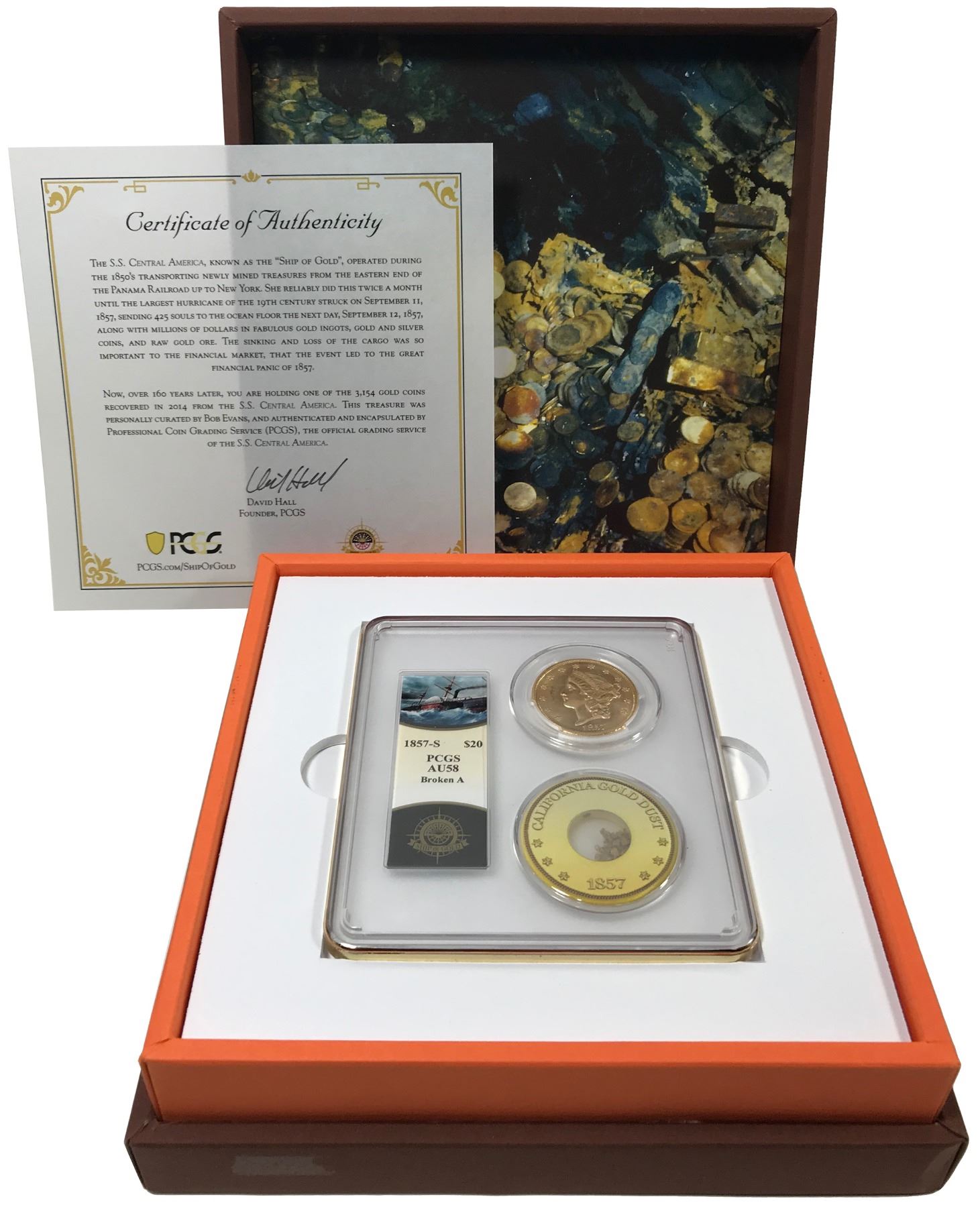 USA (San Francisco mint), gold $20 coronet Liberty "double eagle," 1857-S, broken A, PCGS AU58 / Ship of Gold special presentation case with pinch of gold. 8" x 8" x 2-1/2" (box) From the second SS Central America salvage operation. Light wear on high points, surface hairlines and some typical bagmarks present, still retaining good luster and color. Pinch of gold dust is made of larger, rough nuggets. PCGS #35329639 (label signed by Bob Evans, chief scientist of the operation). Housed in special presentation case with certificate signed by the founder of PCGS, David Hall. Recovered from: S.S. Central America, sunk in 1857 in deep water off North Carolina