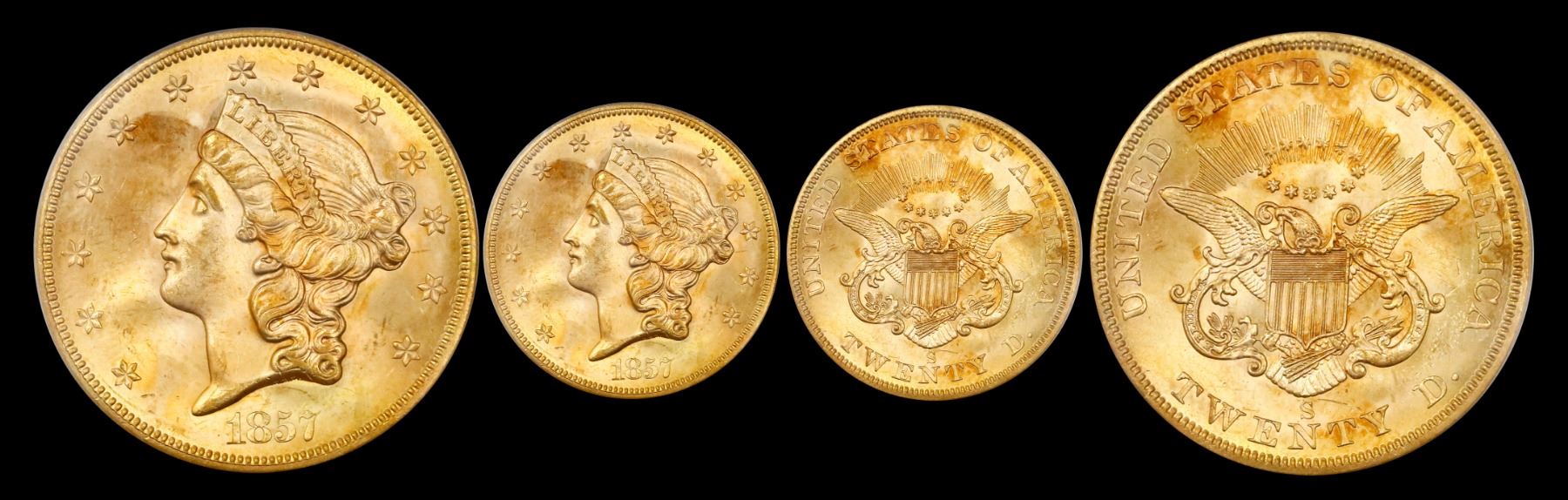 USA (San Francisco mint), gold $20 coronet Liberty "double eagle," 1857-S, variety 20F (no serif, ri