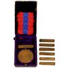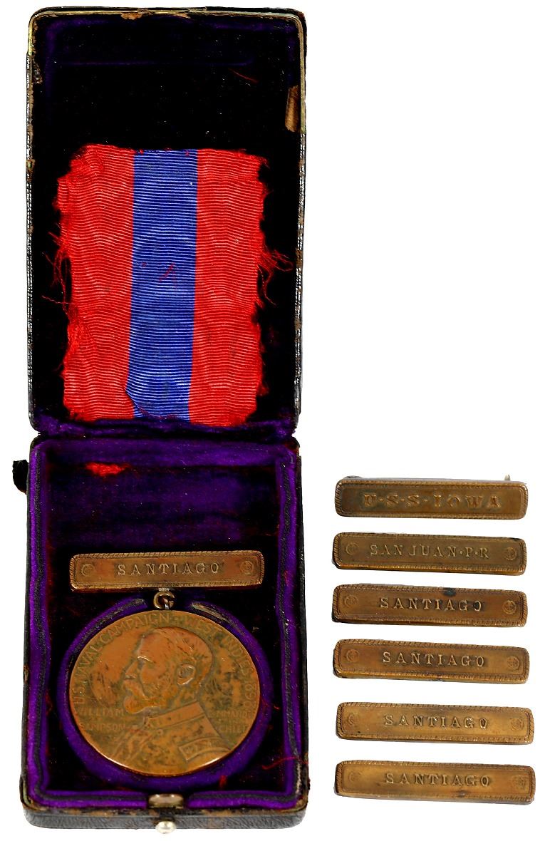 USA, bronze military decoration, 1898, U.S Naval Campaign West Indies (Spanish-American War), awarded to Apprentice Second Class Jesse C. Newton of the battleship USS Iowa, with bars U.S.S. Iowa, San Juan P.R. (May 12), Santiago (May 31) (June 6) (June 16) (July 2) (July 4), with original red-and-blue ribbon and box of issue. 36.23 grams (medal and one bar); 38mm (medal only); box 3-1/2" x 2-1/4" x 3/4". Phase III Sampson medal (bust of Rear Admiral William E. Sampson on obverse, naval soldiers on reverse, SANTIAGO DE CUBA / JULY 3 in exergue), the edge engraved with JESSE C. NEWTON, APP.2D.C. We have been unable to confirm Jesse C. Newton as being on the USS Iowa's roster. Ribbon degraded but included along with original box and all service bars, some flaking on the box cover.
