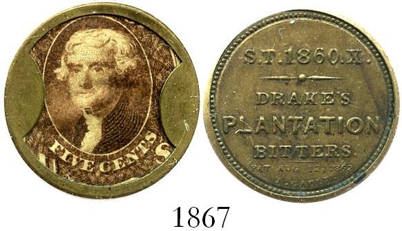 USA, encased postage, 5c red brown, Drake's Plantation Bitters S.T.1860.X. (patent 1862). EP-72. 2.4 grams. Choice specimen with vividly colored stamp, the mica lightly scratched but fully intact, pristine case with no damage or noticeable wear, not a rare issuer but more commonly seen in the 1c denomination.