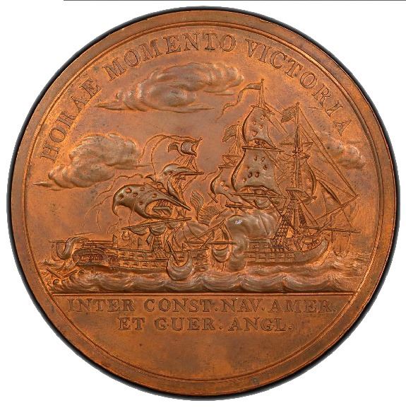 USA, large bronze medal, dated 1812, Captain Isaac Hull / USS Constitution battling HMS Guerriere, by J. Reich, PCGS SP63, finest and only example in PCGS census. Julian-NA-12. 65mm. Obverse: bust of Captain Hull facing left, legend around ISAACUS HULL PERITOS ARTE SUPERAT JUL. MDCCCXII [ET] AUG. CERTAMINE FORTES, R. (for Reich) on truncation. Reverse: the USS Constitution battling the HMS Guerriere during the War of 1812, legend above HORAE MOMENTO VICTORIA and INTER CONST. NAV. AMER. ET GUER. ANGL. in exergue. Edge: plain. Very rare commemorative medal honoring the USS Constitution and her victory over the HMS Guerriere during the War of 1812 while commanded by Captain Isaac Hull. During the battle, British cannonballs fired at her bounced harmlessly off her white oak hull, leading to her nickname "Old Ironsides." Today, the USS Constitution is the oldest ship still afloat and a source of pride for the United States Navy. Designed by engraver John Reich with a scant mintage of 126 pieces in copper. Smooth brown surfaces with sharply rendered details front and back, plentiful red mint luster across the naval battle scene on the reverse. Please use this link to verify the certification number
