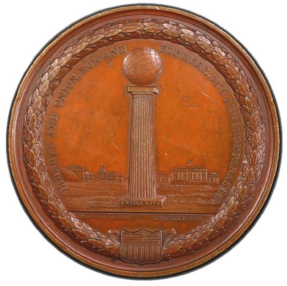 USA, large bronze medal, no date (struck 1852), Daniel Webster, by Charles Cushing Wright, PCGS AU58. Julian-PE-37. 77mm. Impressively heavy medal commemorating the life of statesman Daniel Webster, who died in 1852; designed by Charles Cushing Wright, famous for his Declaration of Independence medals struck around the same time (see prior lot). Obverse: bust of Daniel Webster facing right, DANIEL WEBSTER. flanking, C.C.WRIGHT. D & F. below, rope edge. Reverse: globe atop pillar, I STILL LIVE at base, classical buildings in background, LIBERTY AND UNION, NOW AND FOREVER, ONE AND INSEPARABLE. above, MEADE.BROS.DAG: and F.W.GREEN. PUB: in exergue, encircled with wreath and shield below. High-relief medal with dark brown surfaces showing just a touch of wear on the high points. Please use this link to verify the certification number