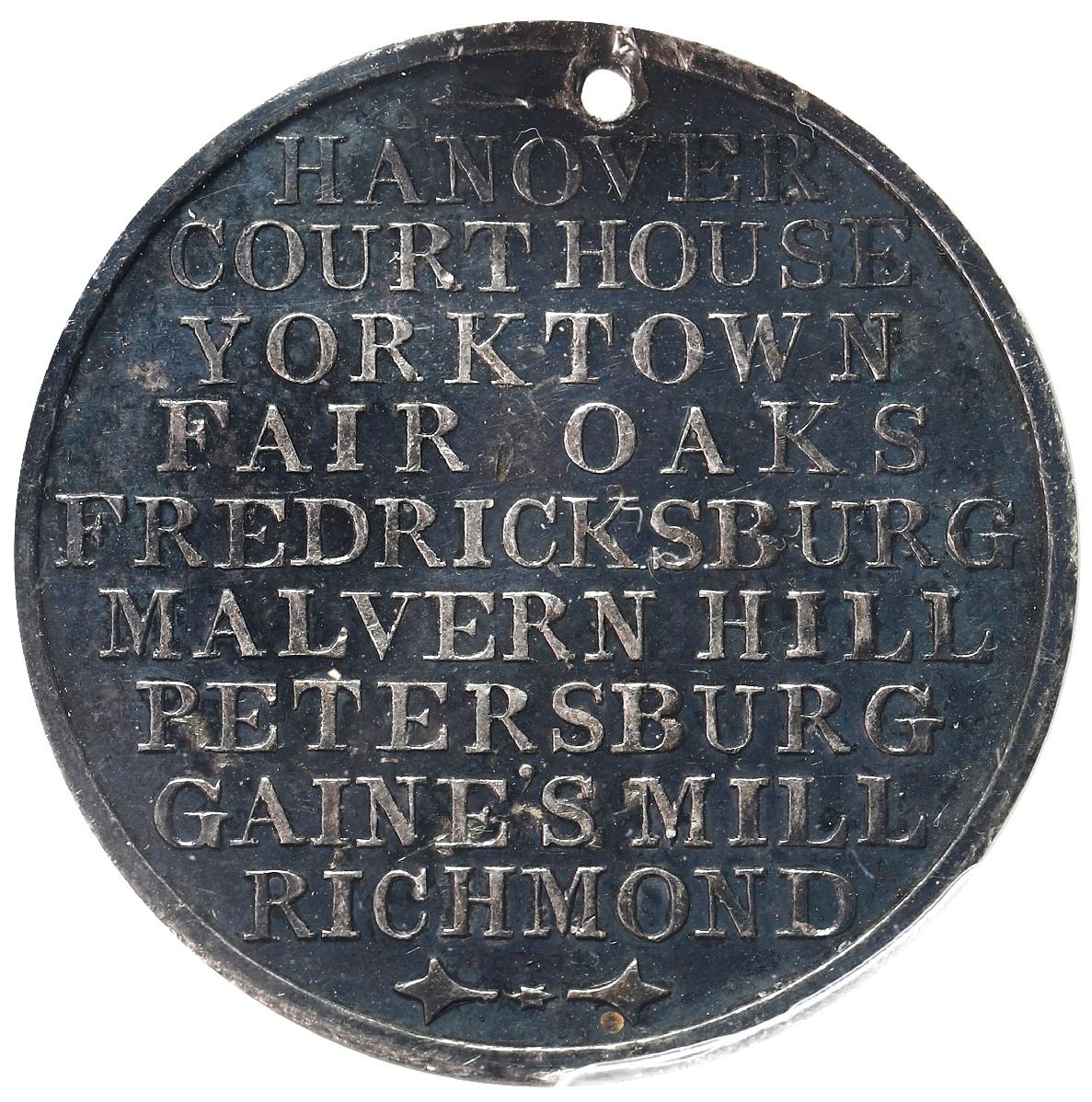 USA, silvered white metal Civil War medal, 1865, 1st Connecticut Volunteer Heavy Artillery veteran's medal, PCGS AU55, finest and only example in PCGS census. 31mm. Obverse: 1ST C.V.H.A. / 1861-1865 with crossed cannon at center. Reverse: HANOVER / COURTHOUSE / YORKTOWN / FAIR OAKS / FREDERICKSBURG / MALVERN HILL / PETERSBURG / GAINE'S MILL / RICHMOND. Edge: smooth. Issued to commemorate a veteran's service with the Connecticut volunteer heavy artillery during the Civil War, dark gunmetal-toned piece with hole at top for suspension from a ribbon. Please use this link to verify the certification number