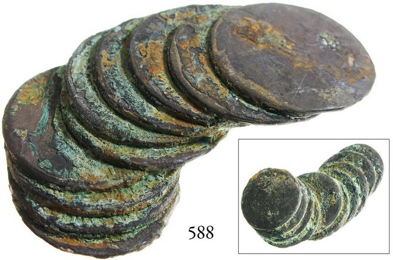 Uncleaned clump of 10 Spanish colonial bust 8 reales (probably Mexico). 240.4 grams. A circular staircase of worn and corroded coins, mostly gray but with green, orange and tan in crevices, a solid and attractive display. Recovered from: Cazador, sunk in 1784 off New Orleans, Louisiana