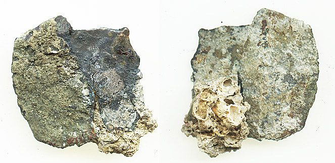Unidentified cob 8R in heavy encrustation. 14.6 grams. Thin and cracked coin (no details visible) with whitish encrustation all over, including a thick raised patch at edge. From the "Coffins Patch" site, with certificate #9928 from the salvagers. Recovered from: Spanish 1733 Fleet, Florida Keys
