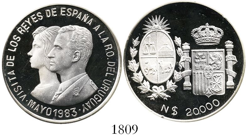 Uruguay, cameo proof piedfort 20,000 nuevos pesos, 1983, Spanish Royal visit, plain edge, rare (only 10 minted). KM-P4. 40.3 grams, 4x33mm. Choice, deeply mirrored surfaces with incipient purple toning, tiny nicks in reverse rim. Pedigreed to Fermin Alvarez.