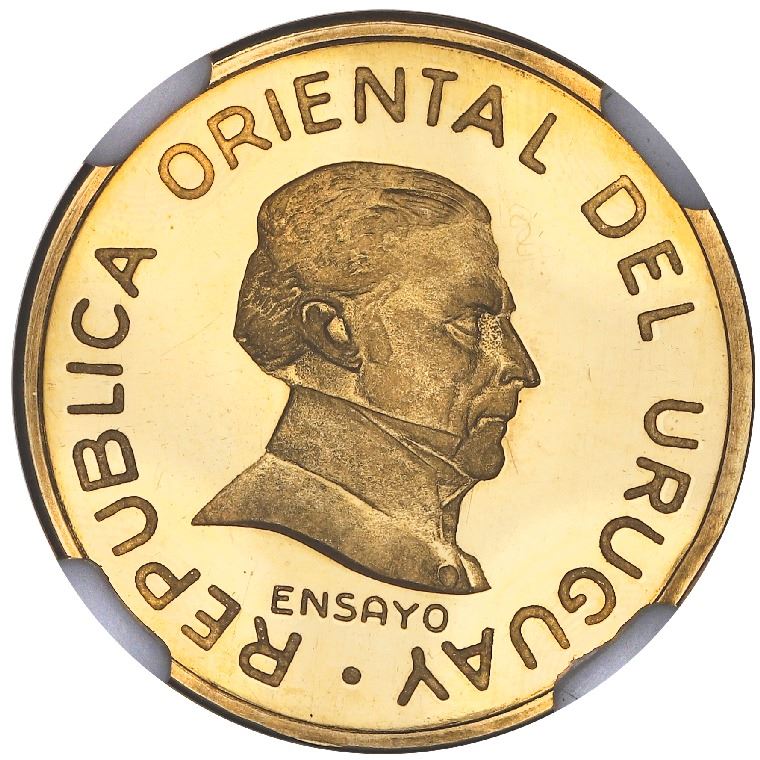 Uruguay, gold proof essai 1 peso, 1994, granulated legends, NGC PF 65 Ultra Cameo, finest and only example in NGC census. KM-unl (cf 103.1 for regular issue in aluminum-bronze). Unlisted off-metal essai in proof gold with mirrored fields and frosted cameo details (enhanced by granular texture), first we have seen or heard of. NGC #4768047-002.