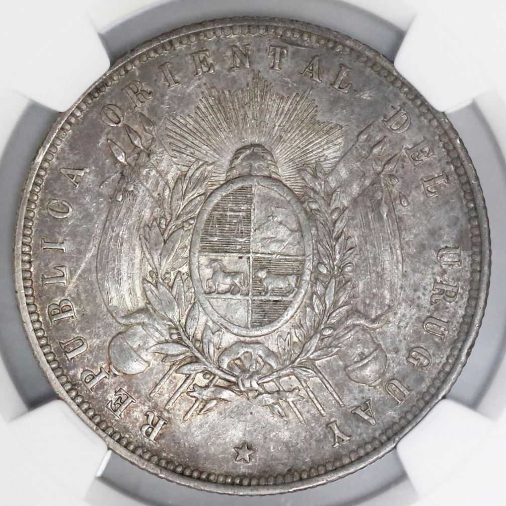 Uruguay (struck in Paris), 1 peso, 1877-A, NGC AU 53. KM-17. Light wear across details but still lustrous, some bagmarks and toned throughout. NGC #4702956-014.