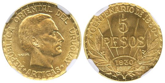 Uruguay (struck in Paris), 5 pesos, 1930, Artigas centennial, encapsulated NGC MS 64. KM-27. Choice grade (practically flawless, in any case above the vast majority of MS coins in the NGC census), low mintage of 14,415 coins.