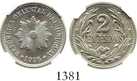Uruguay (struck in Paris, France), copper-nickel 2 centesimos, 1936-A, encapsulated NGC MS 65. KM-20. Highly lustrous.