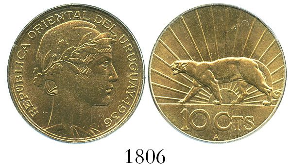 Uruguay (struck in Paris), aluminum-bronze 10 centesimos, 1936-A, encapsulated PCGS MS 65. KM-28. Nice original (yellow) color, muted luster, choice grade.