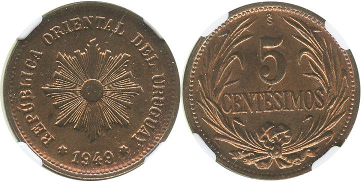 Uruguay (struck in Santiago, Chile), copper 5 centesimos, 1949-So, encapsulated NGC MS 64 RB.