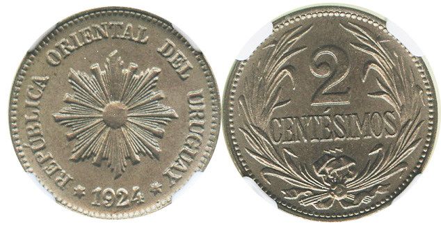 Uruguay (struck in Santiago, Chile), copper-nickel 2 centesimos, 1924-So, encapsulated NGC MS 64.
