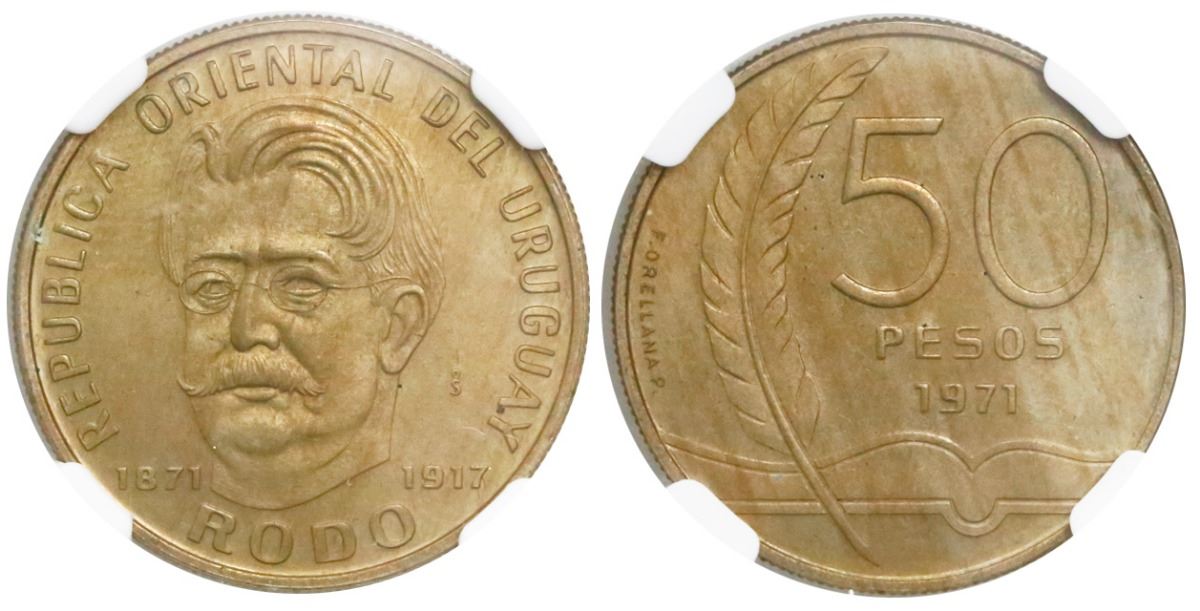 Uruguay (struck in Santiago), brass 50 pesos, 1971, Rodo centennial, "F. Orellana P.," encapsulated