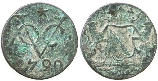 Utrecht, Dutch East India Co., copper duit, 1790, uncleaned, very rare provenance. KM-111.1. 3.1 grams. Small copper coin with attractive coating of green encrustation on both sides, bold details nonetheless, but main attraction is the provenance, from which we have sold only 2 other specimens in the past (including one for over $500 in our Auction #5). Recovered from: Zeeland, sunk in 1793 off Table Bay, South Africa