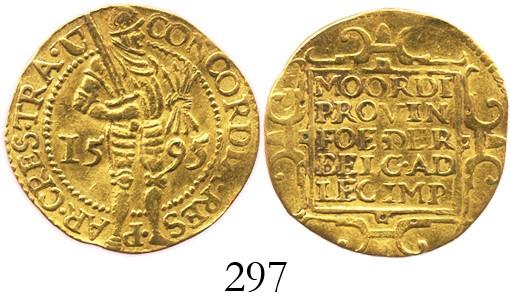 Utrecht, United Netherlands, ducat, 1595. Fr-284. 3.0 grams. Nicely detailed XF/VF, very lightly clipped around the edge.