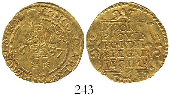 Utrecht, United Netherlands, ducat, 1637. KM-7.1. 3.4 grams. XF with toning around details, weak knight's head, off-center obverse.
