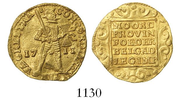 Utrecht, United Netherlands, ducat, 1711, from DeLiefde (1711). KM-7.4 3.48 grams. Mint State with traces of luster (otherwise matte), fully detailed knight's head. From DeLiefde (1711), with certificates and pedigreed to the Ponterio auction of January 2009, with original lot-tag #936.
