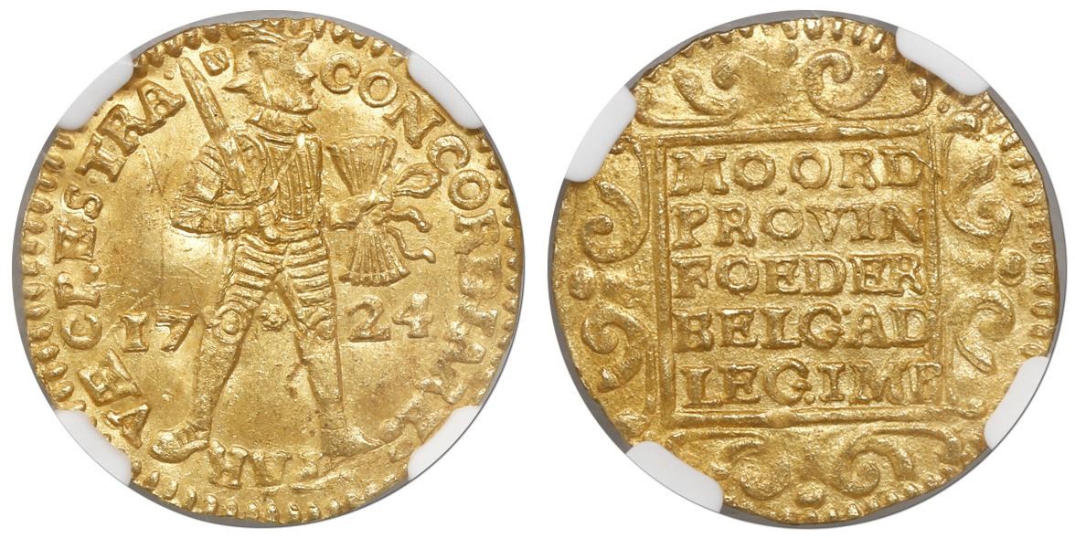 Utrecht, United Netherlands, ducat, 1724, encapsulated NGC MS 62, from the Akerendam (1725), stated