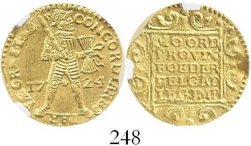 Utrecht, United Netherlands, ducat, 1724, encapsulated NGC MS 63, from the Akerendam (1725). KM-7.4. Superb bold strike (fully detailed) with such clean fields as to show stress lines, mostly lustrous. From the Akerendam (1725).