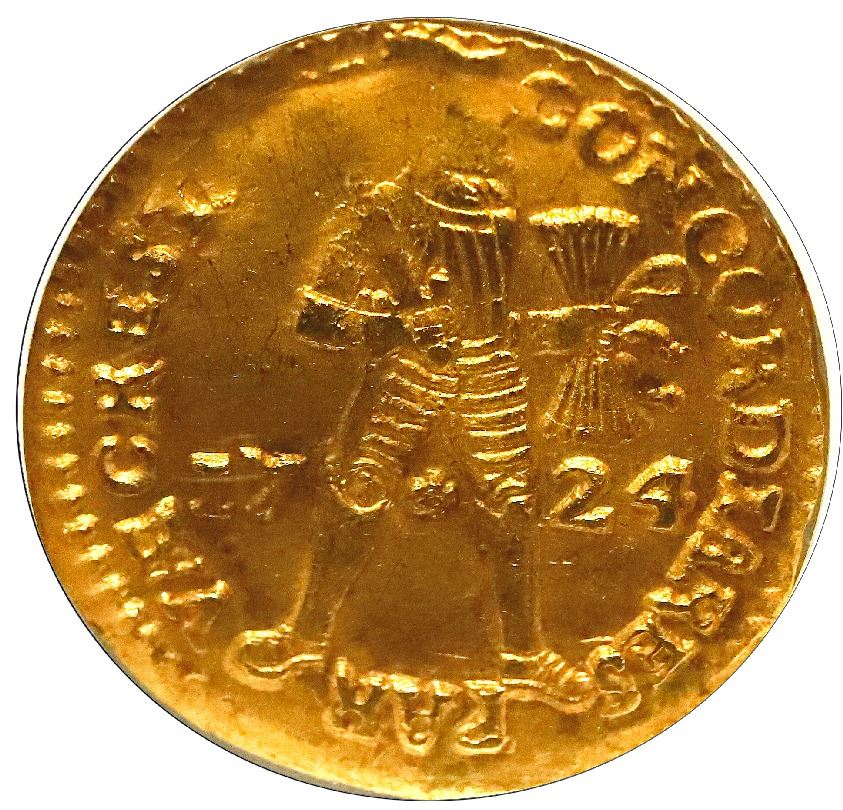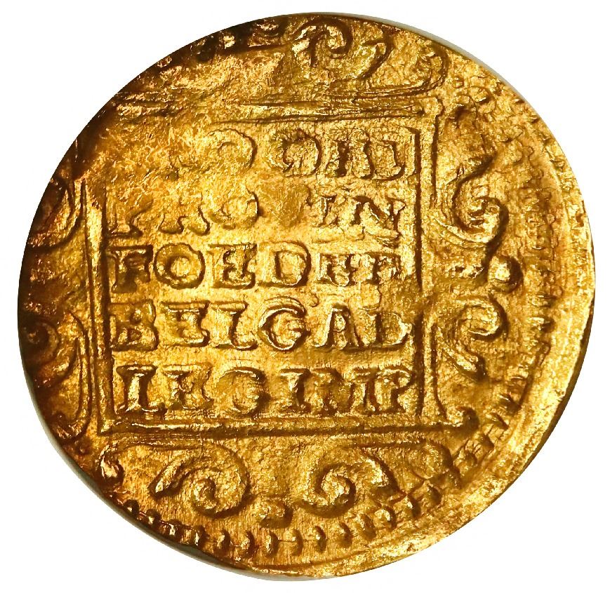 Utrecht, United Netherlands, gold ducat, 1724, NGC MS 61 / Akerendam. KM-7.1; Fr-285. Wavy and uneven flan with resultant weak area at top of obverse (strong strike otherwise), faintly toned. Recovered from: Akerendam, sunk in 1725 off Norway